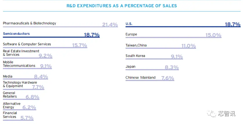 数据显示,美国半导体企业的研发投入在销售额当中的平均占比高达18.7%,紧随其后的分别是欧洲(15%)、中国台湾(11%)、韩国(9.1%)、日本(8.3%)、中国大陆(7.6%)。