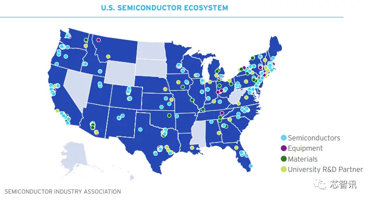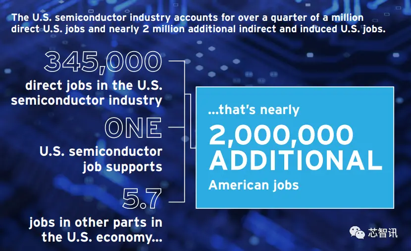 目前美国半导体行业在研发、设计和制造活动等方面直接雇佣了大约345000多名工人(其中包括9000名EDA工作人员,10万名芯片设计人员,3万名芯片设备行业从业人员,20.6万名半导体制造业工作人员)。此外,对于直接受雇于半导体行业的每一名美国工人,在更广泛的美国经济中,无论是在半导体行业的供应链中,还是通过供应链中公司本身雇佣人员的工资支出,都会额外支持5.7个工作岗位。
