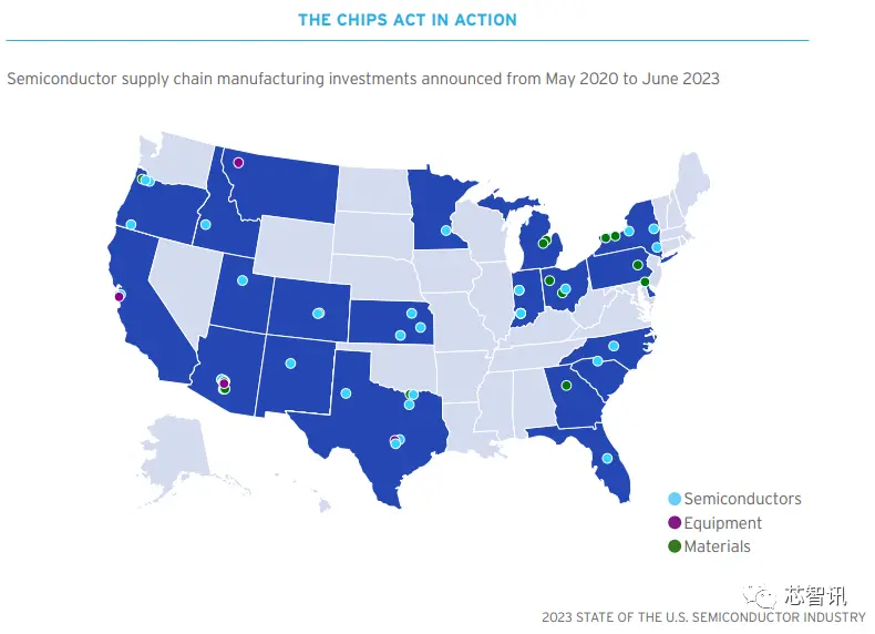 根据美国商务部最新公布的信息显示,截至2023年5月,已收到400多份芯片项目意向书,反映出整个供应链对美国“芯片法案”激励计划的广泛兴趣。自2020年美国“芯片法案”酝酿以来,已经陆续有20个州的数十个项目被宣布,投资额远超2000亿美元。这些项目将仅在美国半导体生态系统中就创造数万个新的高质量工作岗位,并将在整个美国经济中创造数十万个受支持的工作岗位。随着项目申请过程的进行,宣布的项目数量预计将进一步增长,将持续壮大美国全国范围内的半导体生态系统。