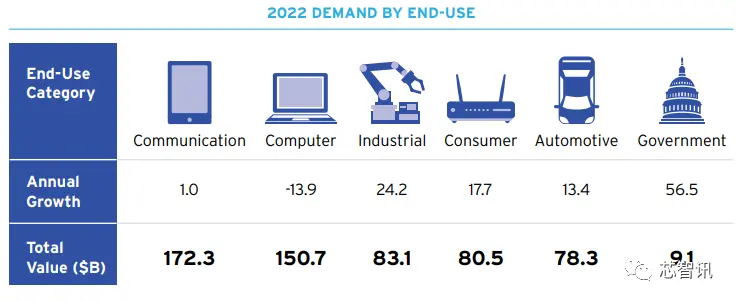 △从销售额变化来看,2022年,通信领域的半导体销售额同比增长了1%至1723亿美元;计算机相关半导体销售额同比下滑了13.9%至1507亿美元;工业领域的半导体销售额同比增长了24.2%至831亿美元;其他消费类领域的半导体销售额同比增长17.7%至805亿美元;汽车领域的半导体销售额同比增长17.7%至783亿美元;政府方面的半导体销售额同比增长56.5%至91亿美元。
