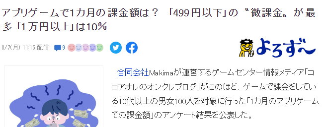 众所周知,虽然如今的手游基本都是“免费”,但是毫不影响上架赚钱,原因就是内部氪金,日前日媒发起了手游玩家月额氪金调查,结果显示 499日元以下微氪占比最高。