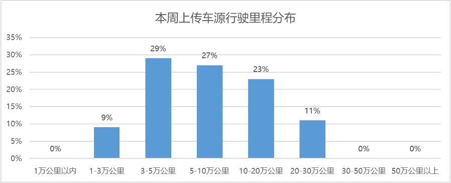 从上传车源行驶里程数据来看,本周上传数据中,5万公里以内的“较新车”数据较上周降低了1%,5-10万公里的“性价比”车源数据同样较上周降低1%,10万公里以上的车源数据增加了1%。
