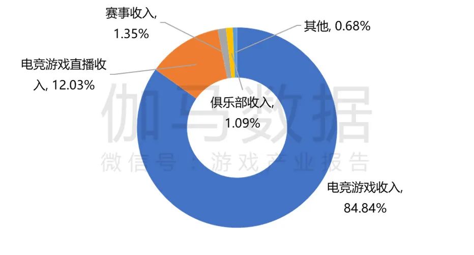 2023年1-6月,中国电竞产业收入中,电竞游戏收入占比84.84%;电竞游戏直播收入占比12.03%;赛事、俱乐部以及其他收入占比分别为1.35%、1.09%和0.68%。