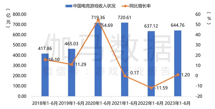 2023年1-6月,中国电竞游戏收入为644.76亿元,同比增长1.20%。头部电竞游戏收入稳中有升,新兴电竞游戏的收入上升趋势初步呈现。