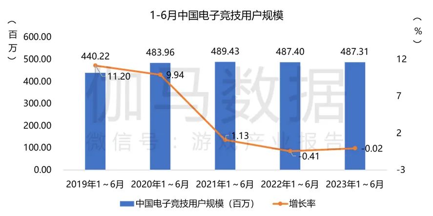 2023年1-6月,中国电子竞技用户规模为4.87亿,同比下降0.02%。