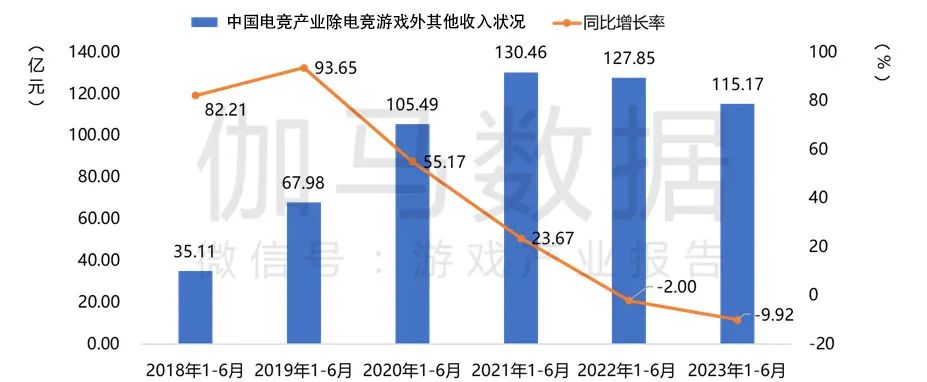 2023年1-6月,中国电竞产业除游戏收入外的直播、赛事、俱乐部及其他收入共计115.17亿元,同比下降9.92%。
