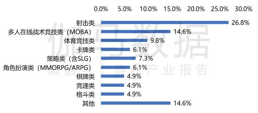2023年1-6月,主要的电竞产品中,射击类最多,占比26.8%;多人在线战术竞技类次之,占比14.6%;体育竞技类占比9.8%。