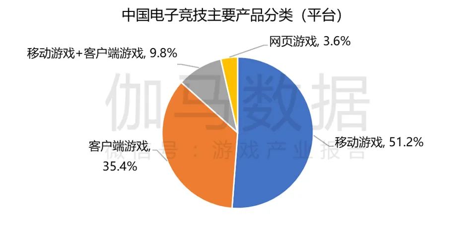 2023年1-6月,按平台分类,主要的电竞产品中移动产品占比51.2%,客户端产品占比35.4%,两者兼具产品占比9.8%,网页产品占比3.6%。