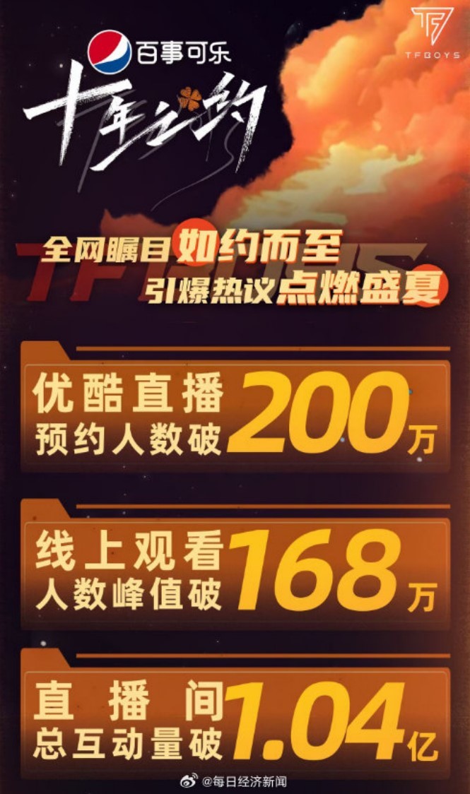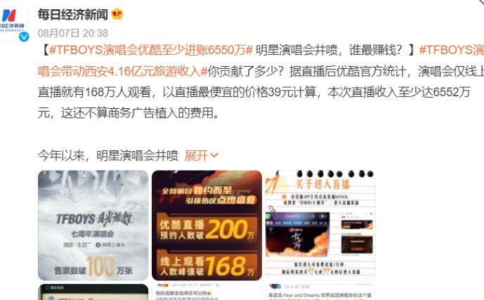 据每日经济新闻报道,据直播后优酷官方统计,演唱会仅线上直播就有168万人观看,以直播最便宜的价格39元计算,本次直播收入至少达6552万元,这还不算商务广告植入的费用。