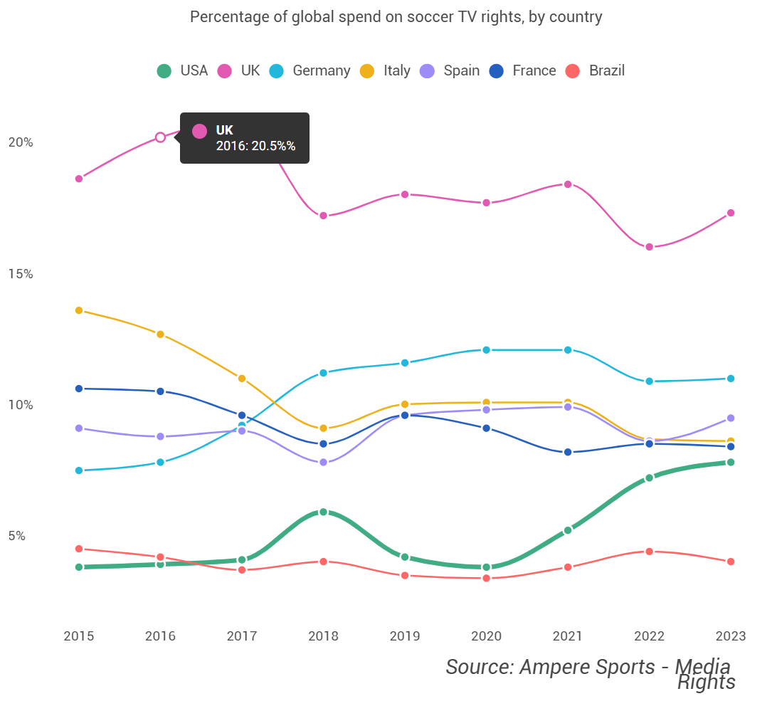 那些一直关注足球生意的人不会对这项运动在美国成为一项主要运动的努力感到惊讶。美国是迄今为止全球最大的体育转播市场:Ampere估计,到2023年美国转播商在体育转播权上的总支出将达到227亿美元,是第二大市场(英国)的5倍多。