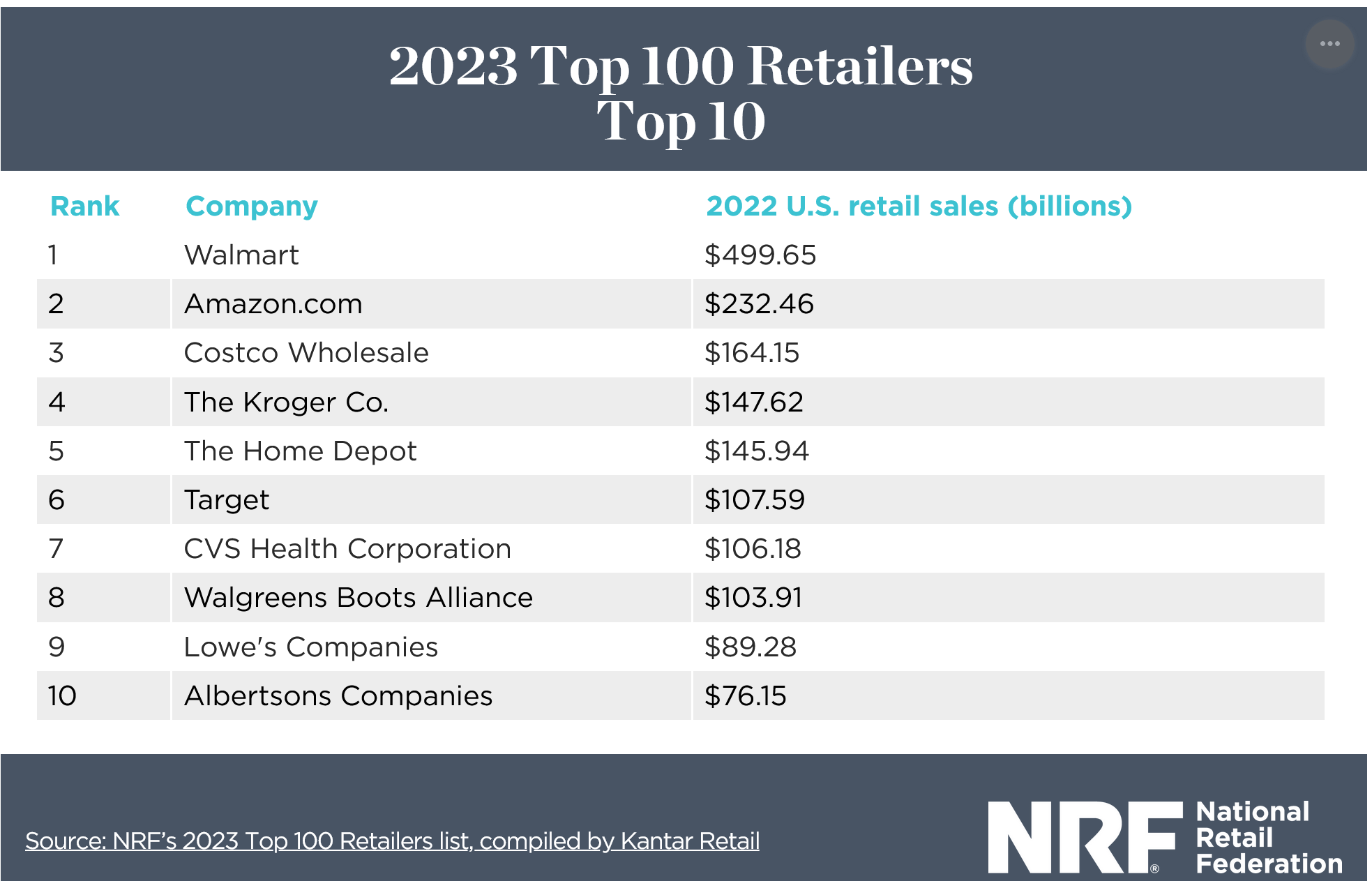 根据美国零售联合会(NRF)最近发布的一份榜单,沃尔玛仍是美国最大的零售商,到2022年其国内销售额约为5000亿美元。这比2021年增长了7.8%,比十年前的销售额增长了约50%。