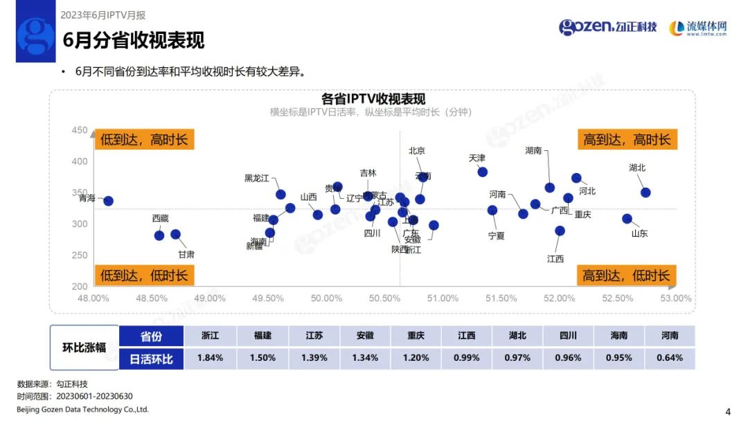 6月不同省份到达率和平均收视时长有较大差异;