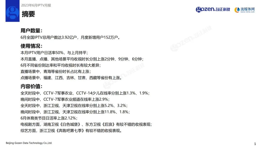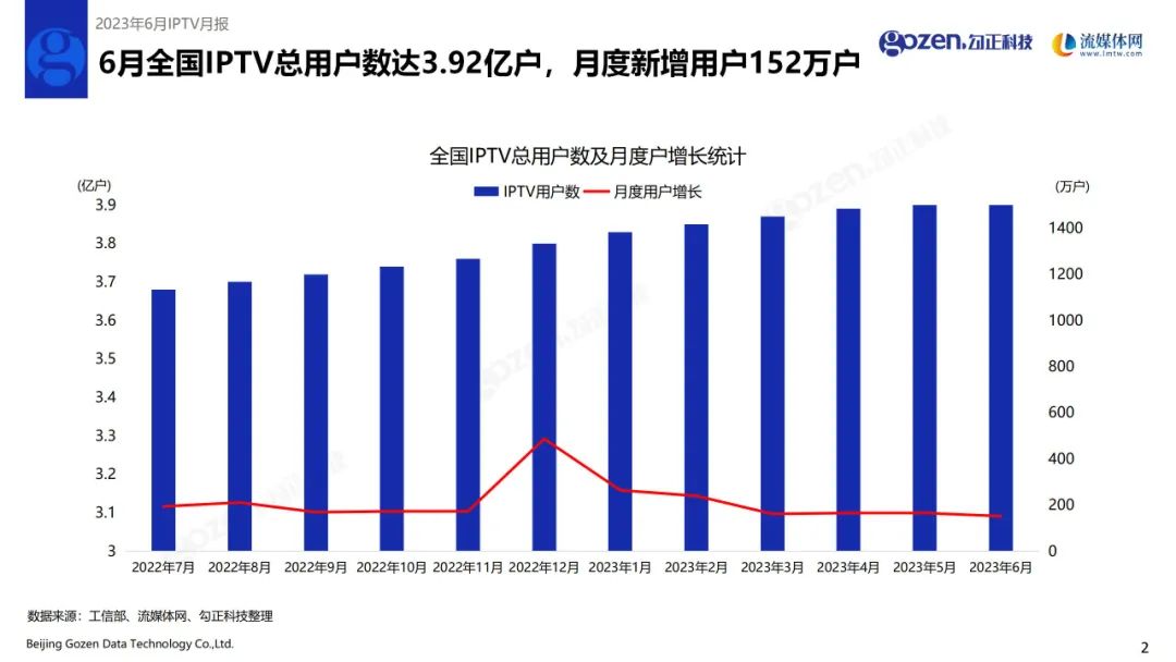 6月全国IPTV总用户数达3.92亿户,月度新增用户152万户。
