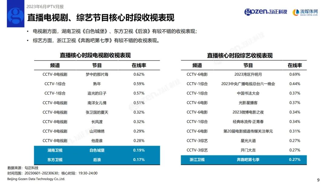 晚间时段中,浙江卫视、天津卫视在线率分别上涨11.8%、1.8%;