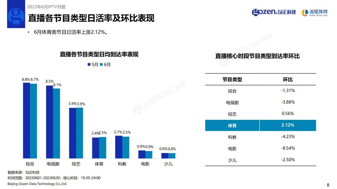 6月体育类节目日活率上涨2.12%;
