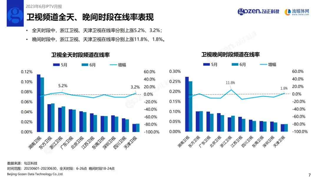 全天时段中,浙江卫视、天津卫视在线率分别上涨5.2%、3.2%;