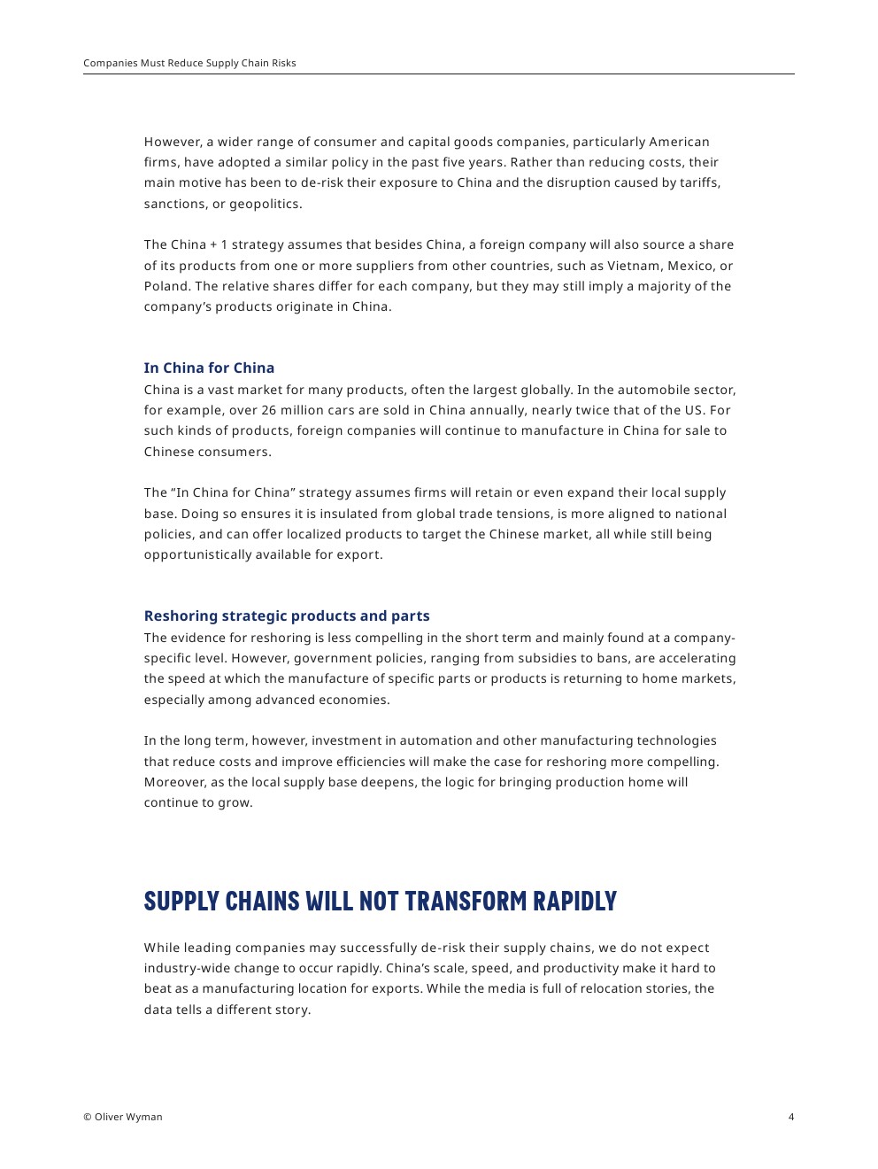 但是,跨国公司正在采取一系列策略,减少在中国的风险敞口。这些战略包括“中国+ 1”或战略性产品和零部件的回流,尤其是在敏感行业。