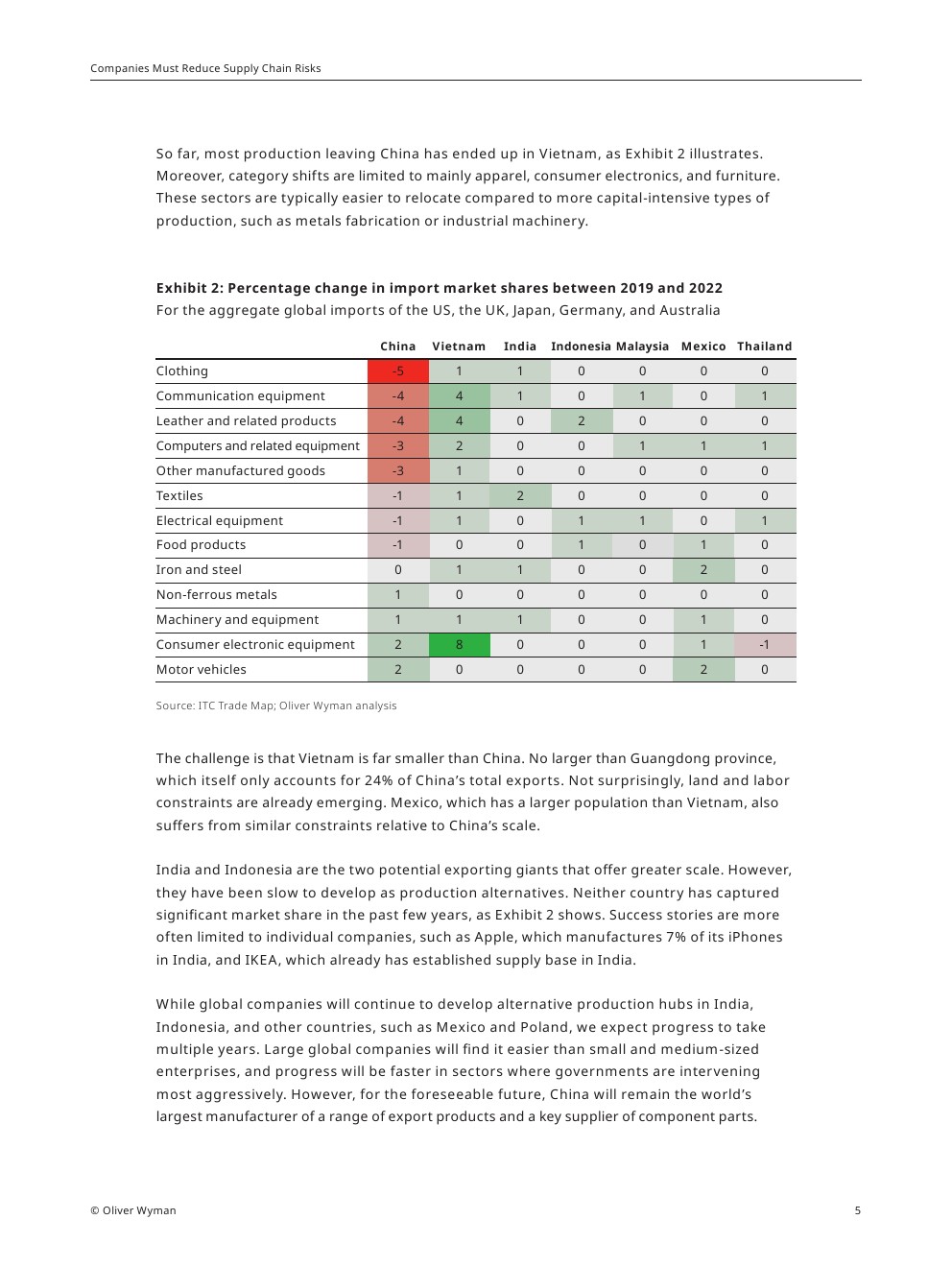 但是,更大范围的消费品和资本品公司,尤其是美国公司,在过去五年中采取了类似的政策。他们的主要动机不是降低成本,而是降低在中国的风险,以及关税、制裁或地缘政治造成的干扰。