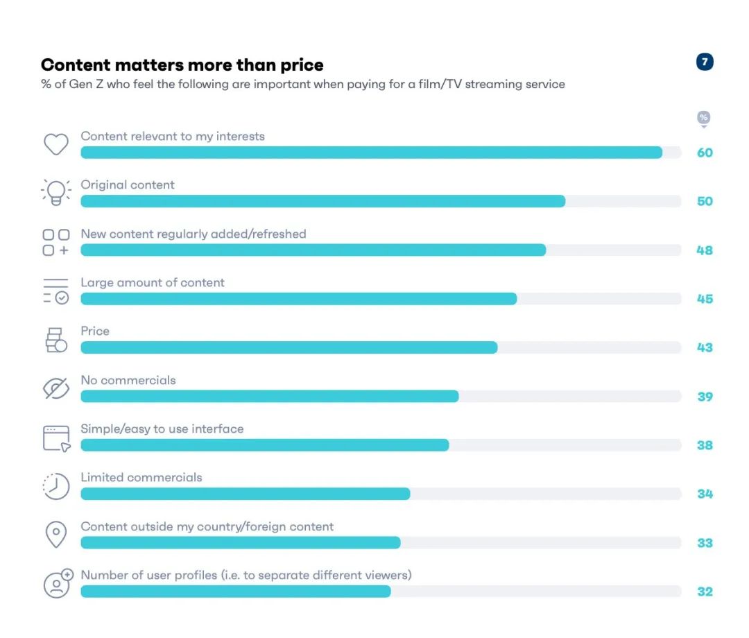 但价格并不是最重要的。在为流媒体服务付费时,与他们的兴趣相关的内容、原创内容、定期添加的新内容以及大量内容对于这些受众来说是最重要的。对于希望保持这一群体参与度的品牌来说,内容确实是王道。