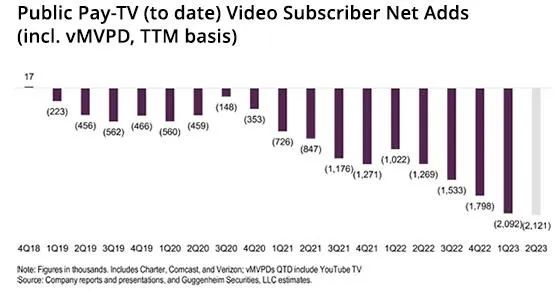 古根海姆称,2023年第二季度,从分销商那里减少的视频用户为81.3万人,约占付费电视公司的71%,约占付费电视总用户的44%。