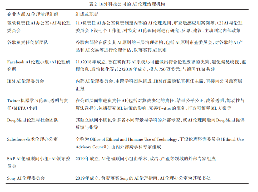 在企业层面,科技企业作为AI技术创新和产业应用的主体,担负着负责任地研发应用AI的重要责任。在国外,从提出AI伦理原则,到成立内部的AI伦理治理机构,再到开发管理和技术工具甚至商业性的负责任AI解决方案,科技公司探索出了较为成熟的经验,积累了很多可资推广的实践做法(表2)[13]。近年来,国内科技公司积极落实监管要求,探索相关自律措施,主要包括:发布AI伦理原则,建立内部的AI治理组织(如伦理委员会),针对AI活动开展伦理审查或安全风险评估,对外披露算法相关信息、促进算法公开透明,探索应对AI伦理问题的技术解决方案(如针对合成信息内容的检测识别工具、AI治理测评工具、联邦学习等隐私计算方案),等等。