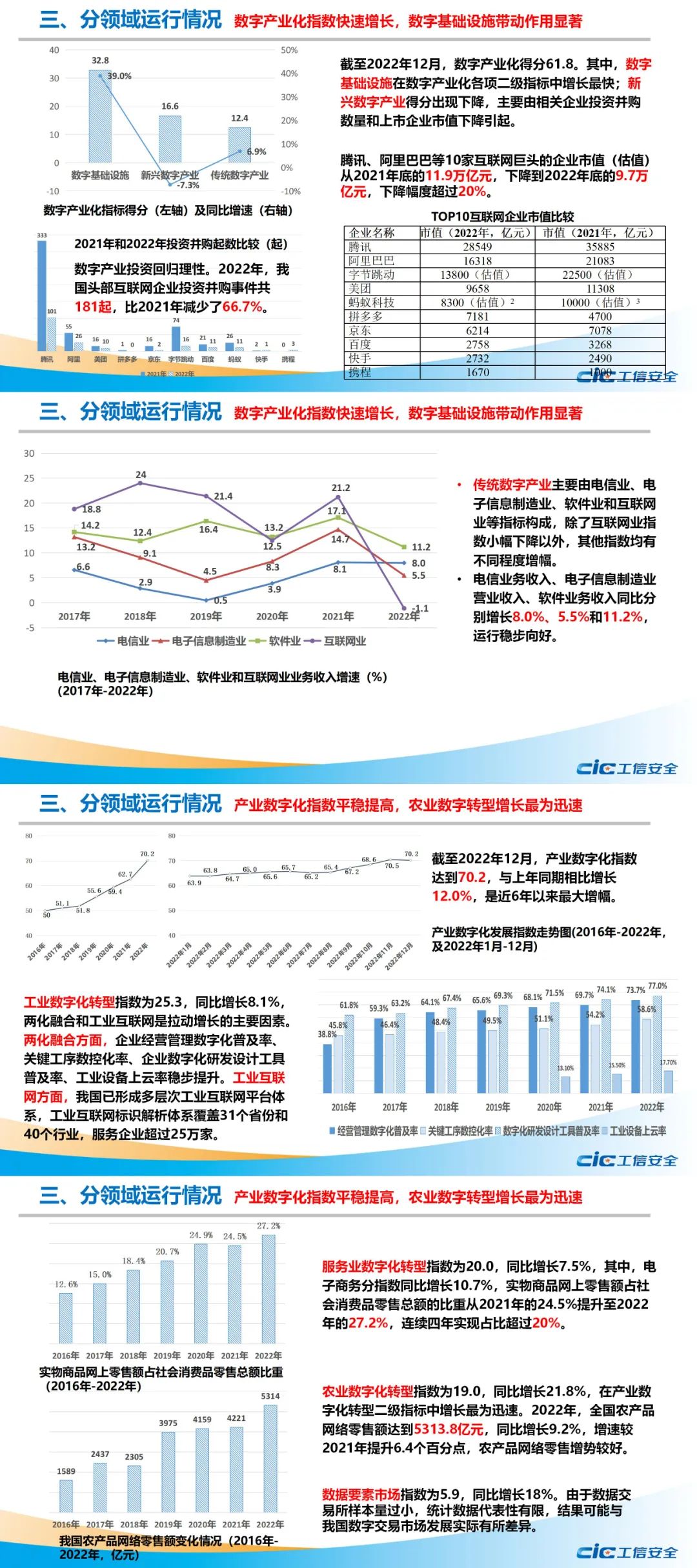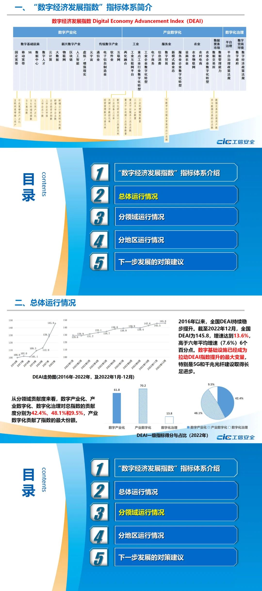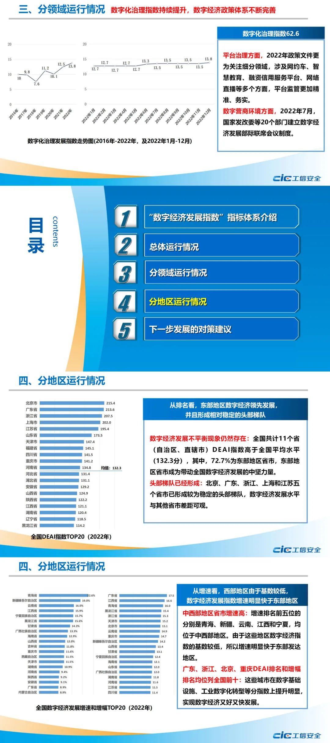 研究发现,2022年,全国数字经济发展指数DEAI得分为145.8,同比增长13.6%。从分领域看,一级指标数字产业化、产业数字化、数字化治理均大幅提升,数字产业化下属“新兴数字产业”分指标得分有所下降,在全球经济增长放缓、互联网人口红利消失、中美博弈持续加码等多重压力下进入调整期,企业投资并购数和上市企业市值均有下降。从分地区看,北京、广东、浙江、上海、江苏连续两年DEAI排名前五,且与其他省市得分拉开距离,形成相对稳定的数字经济发展头部梯队,数字市场主体、数字创新资源、数字经济核心产业等资源要素在这些地区高度集中。数字经济发展水平高的地区更加注重发展产业数字化,而数字经济发展相对滞后的地区仍处于数字基础设施引领发展阶段,数字产业基础薄弱,产业链条尚未形成,发展产业数字化时动力不足。