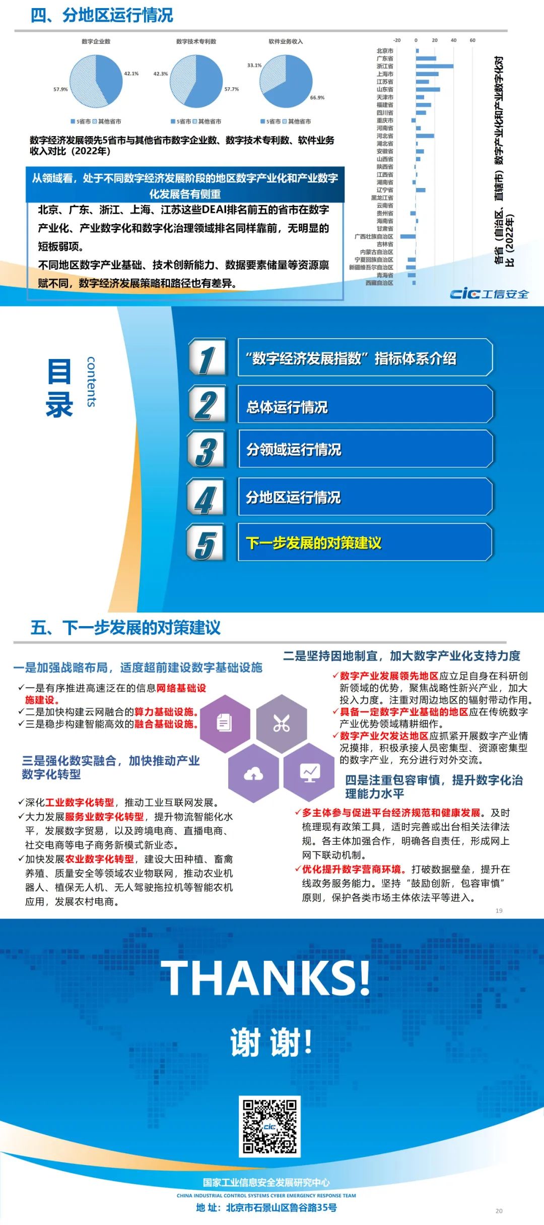 下一步,为持续推动我国数字经济高质量发展,报告建议加强战略布局,适度超前建设数字基础设施;坚持因地制宜,加大数字产业支持力度;强化数实融合,加快推动产业数字化转型;注重包容审慎,提升数字化治理能力水平。