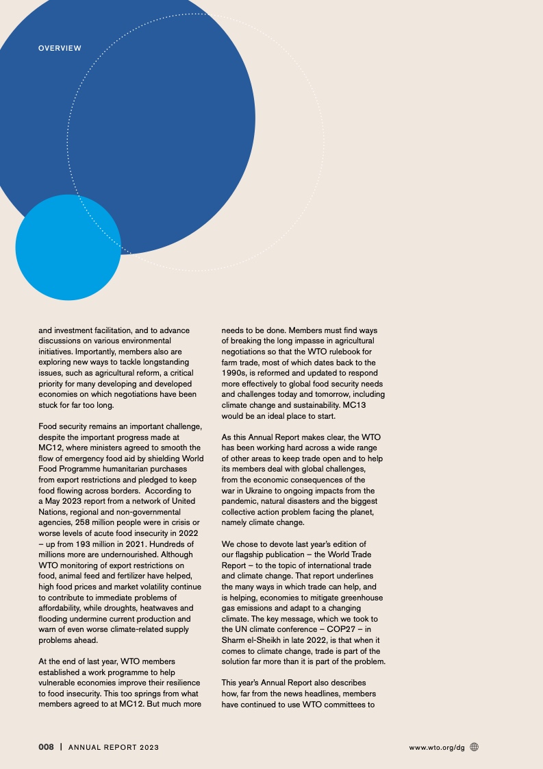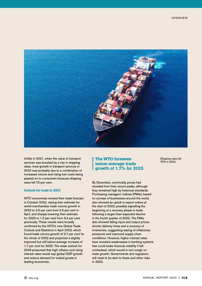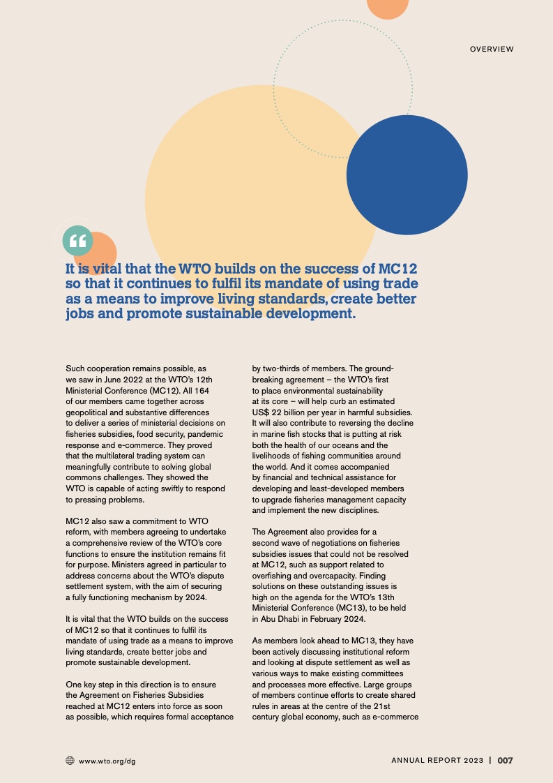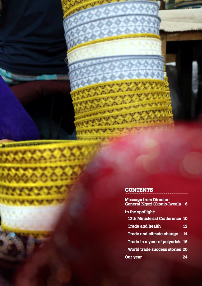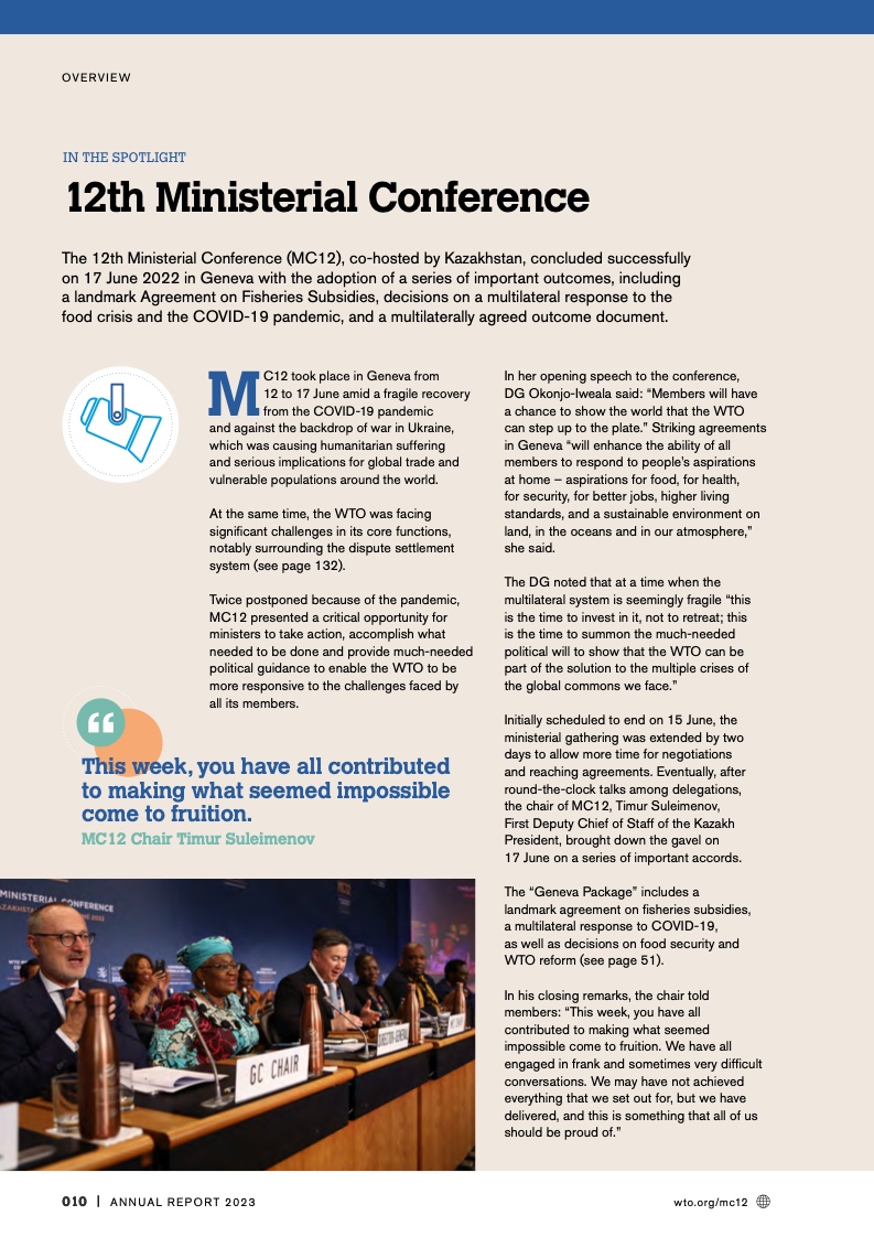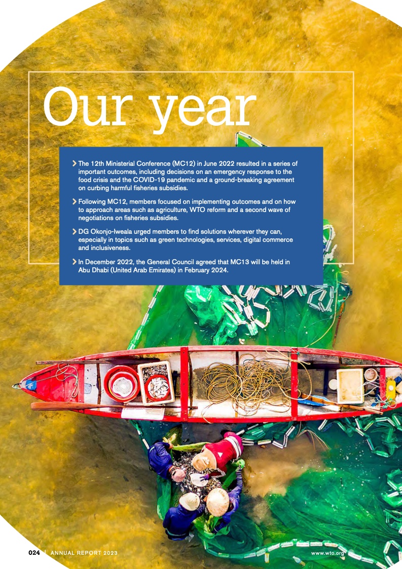 世贸组织发布了《2023年度报告》,全面介绍了该组织在2022年和2023年上半年的活动。报告回顾了过去一年的重要事件,如世贸组织第十二届部长级会议(MC12),以及世贸组织在应对气候变化、新冠疫情和粮食安全等全球挑战方面所做的工作。