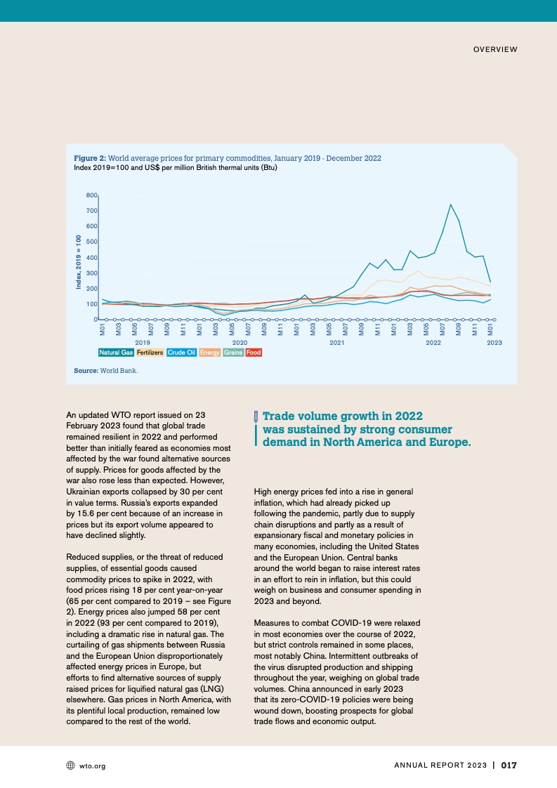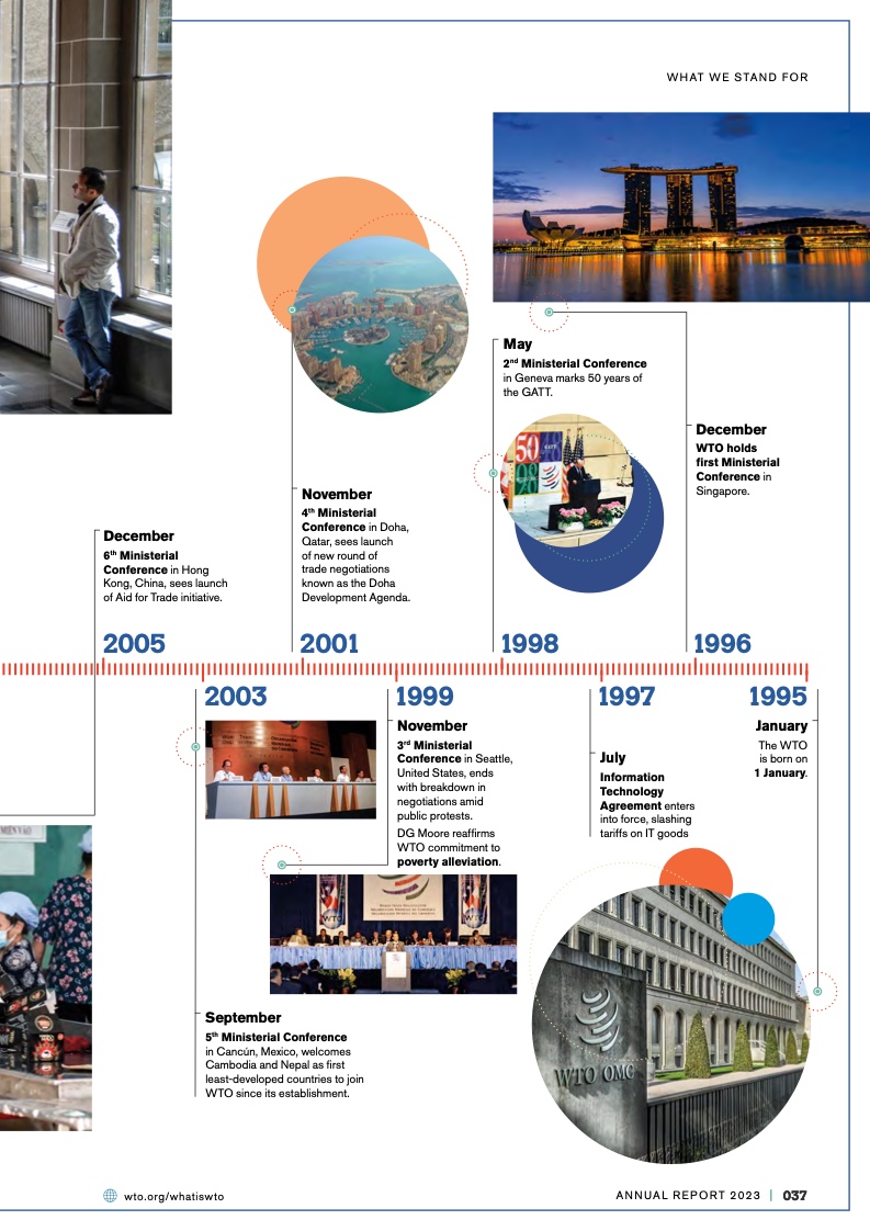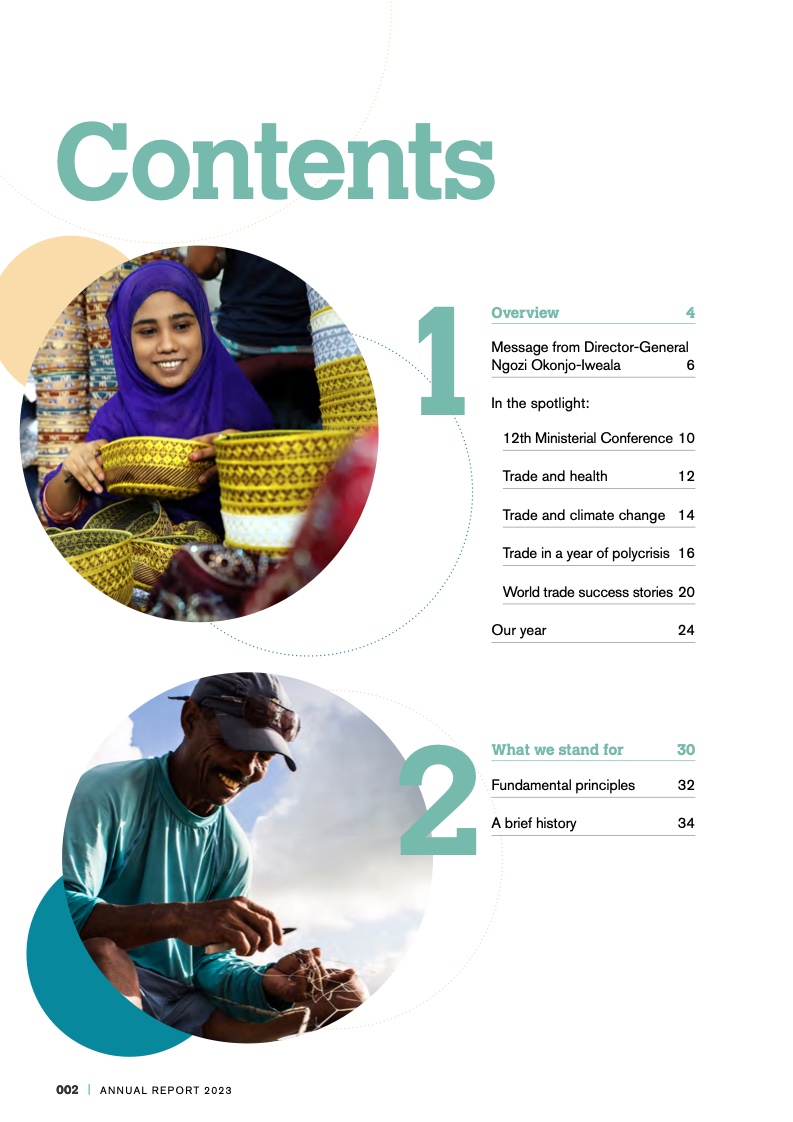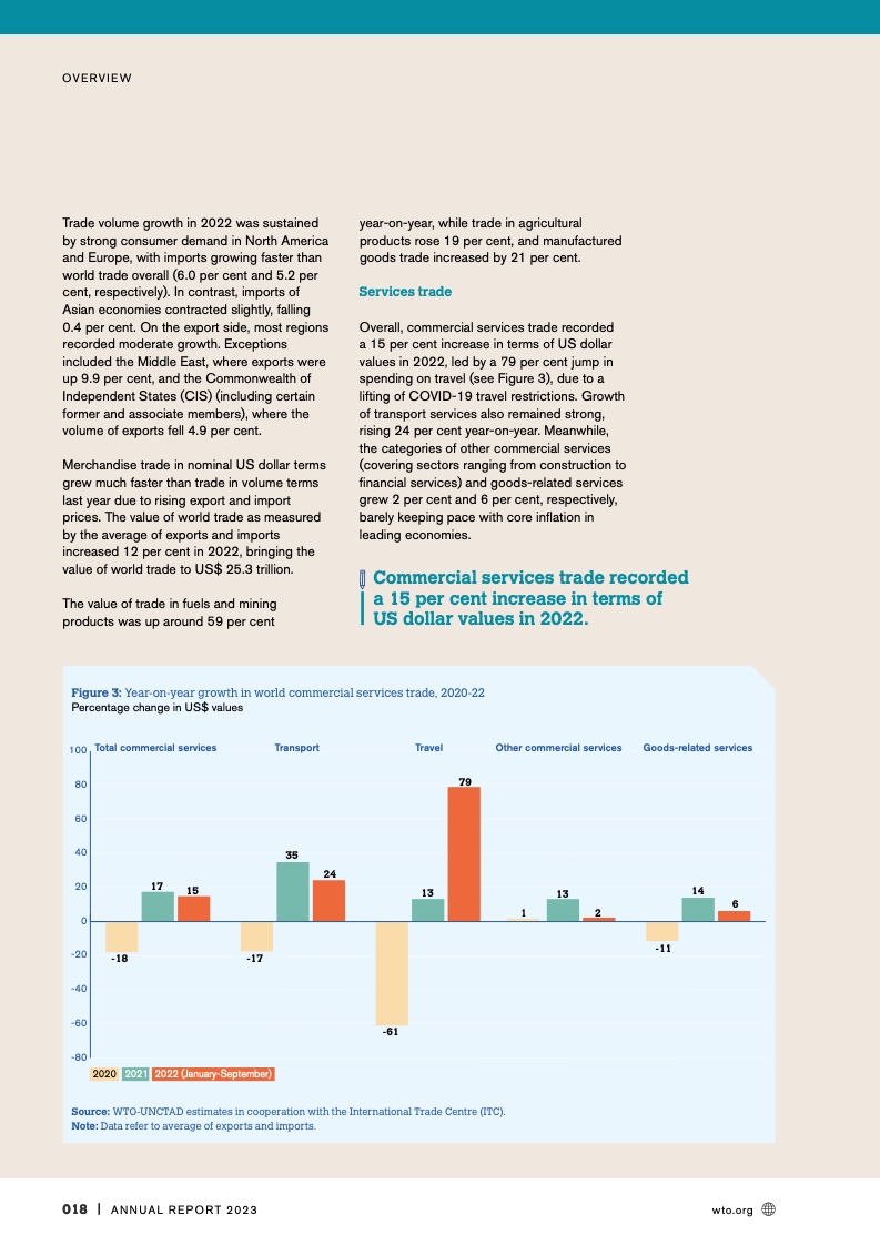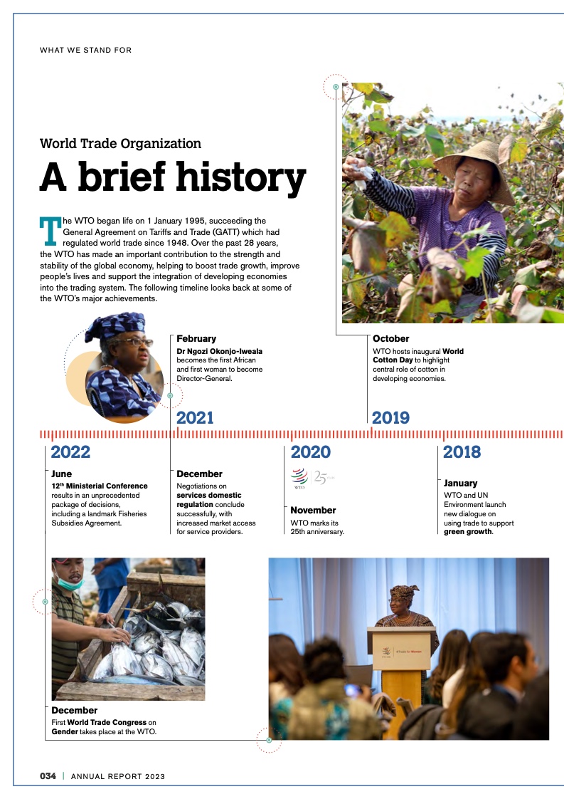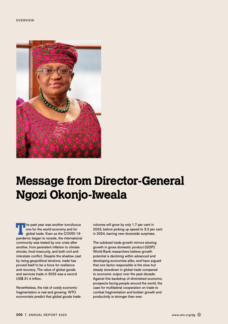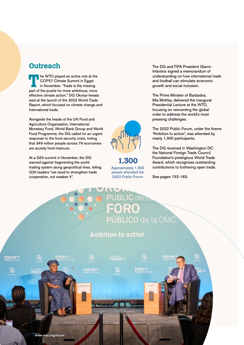 世贸组织发布了《2023年度报告》,全面介绍了该组织在2022年和2023年上半年的活动。报告回顾了过去一年的重要事件,如世贸组织第十二届部长级会议(MC12),以及世贸组织在应对气候变化、新冠疫情和粮食安全等全球挑战方面所做的工作。