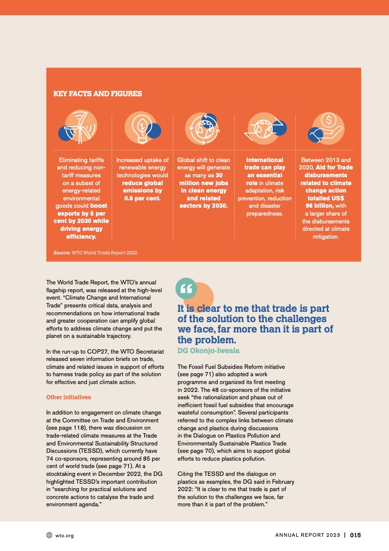 正如本年度报告所明确指出的,世贸组织一直在其他广泛领域努力工作,以保持贸易的开放,并帮助其成员应对全球性挑战,从俄乌冲突的经济后果到新冠疫情、自然灾害和地球面临的最大集体行动问题“气候变化”的持续影响。在去年的旗舰出版物《世界贸易报告》中专门讨论国际贸易与气候变化这一主题。该报告强调了贸易可以通过多种方式帮助各经济体减少温室气体排放,适应不断变化的气候。我们向2022年底在沙姆沙伊赫举行的联合国气候大会(COP27)传达的关键信息是,在气候变化问题上,贸易是解决方案的一部分,而不是问题的一部分。