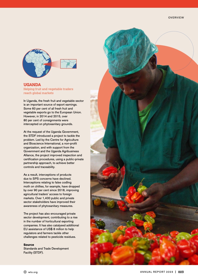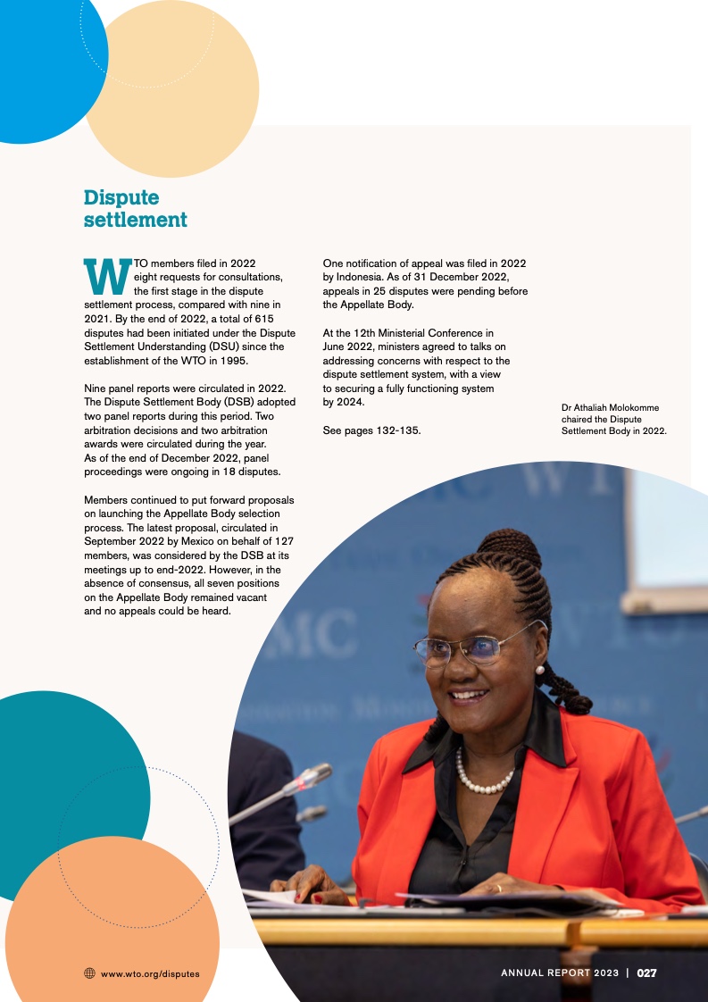 今年的年度报告还介绍了在远离新闻头条的情况下,各成员如何继续利用世贸组织各委员会提出贸易关切,并为他们遇到的问题寻求解决方案。此外,报告还简要介绍了为政府官员(2022年超过5500人)提供培训的持续工作,以帮助他们更好地了解世贸组织的规则,从而帮助他们的经济从多边贸易体制创造的经济机遇中获益。