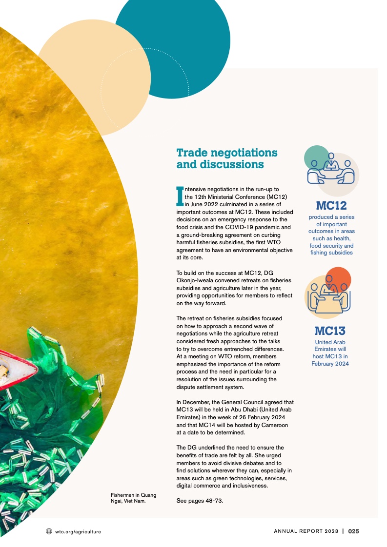 该协定还规定就第十二届部长级会议未能解决的渔业补贴问题(如与过度捕捞和产能过剩有关的支持)进行第二轮谈判。就这些悬而未决的问题找到解决方案是将于 2024 年 2 月在阿布扎比举行的世贸组织第十三次部长级会议(MC13)的重要议程。
