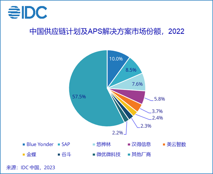 IDC于2023年7月正式发布了《中国供应链计划及 APS 解决方案市场份额,2022:爆发前夜》(#CHC50259023)。报告针对2022年该市场的规模、增长速度、主要玩家、市场与技术的发展趋势等内容进行了详细研究。报告数据显示,2022 年中国供应链计划及 APS 解决方案总市场份额达到13.6亿元人民币,年增长率为 34.05%,与其他工业软件相比有较高的增速。主要影响因素是中国市场供应链计划及APS需求持续释放,同时市场供给的数量和质量双双提升,此外,较低的渗透率和市场基数也是高增速的前提条件。IDC预测,该市场未来几年仍会保持较高增长速度。