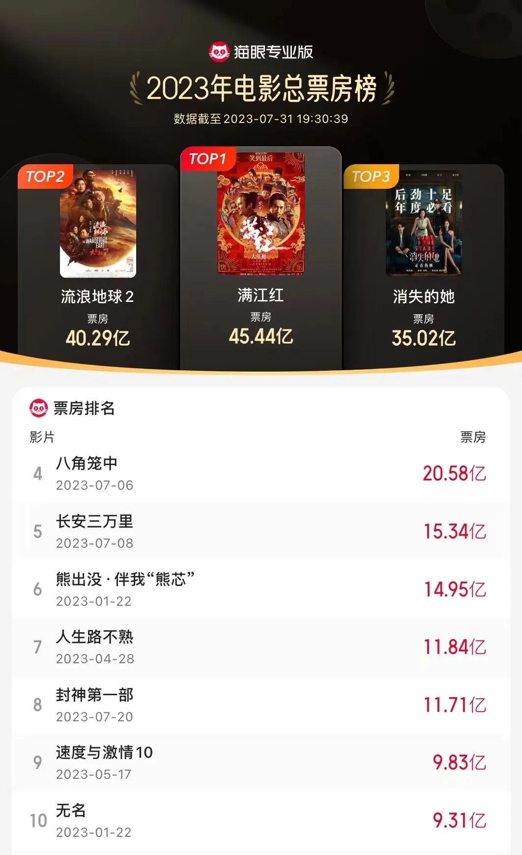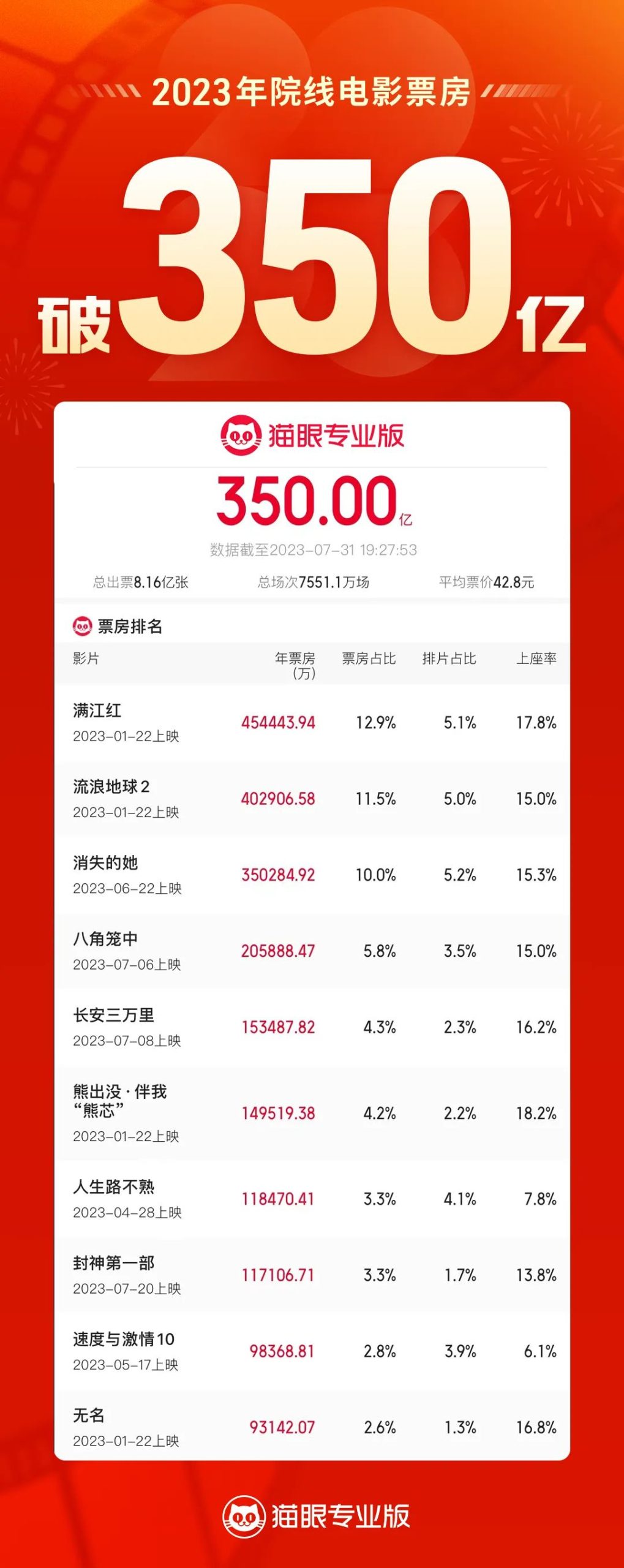 猫眼:2023年度票房破350亿 据猫眼专业版数据,2023年7月31日19时27分,2023年度大盘票房(含预售)破350亿,总人次8.16亿,总场次7551.1万场 2023年度票房TOP10 1:《满江红》 2:《流浪地球2》 3:《消失的她》 4:《八角笼中》 5:《长安三万里》 6:《熊出没·伴我“熊芯”》 7:《人生路不熟》 8:《封神第一部》 9:《速度与激情10》 10:《无名》 更多阅读:猫眼:2024端午档首日票房1.16亿猫眼:2023暑期档票房破170亿猫眼:2023暑期档票房破140亿猫眼专业版:2023年端午档新片预售总票房破5000万电资办:2024年4月29-5月5日全国电影票房周报电资办:2024年5月6-12日全国电影票房周报电资办:2023年6月5-11日全国电影票房周报电资办:2024年10月14日-10月20日全国电影票房周报电资办:2024年9月30日-10月6日全国电影票房周报电资办:204年7月8-14日全国电影票房周报电资办:2024年6月3日-6月9日全国电影票房周报电资办:2024年5月27日-6月2日全国电影票房周报电资办:2024年4月全国电影票房月报电资办:2023年7月24日-7月30日全国电影票房周报电资办:2023年7月3日-7月9日全国电影票房周报