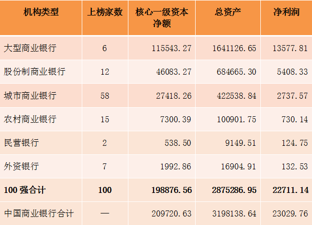 2023年8月,中国银行业协会推出本年度“中国银行业100强榜单”,以核心一级资本净额为依据排序,并对前100家商业银行的经营规模、盈利能力、运营效率和资产质量等进行综合展示。2023年榜单以2022年银行年报数据为基础,覆盖所有类型商业银行。特别是,首次将外资法人银行纳入排名,以更加完整地反映银行业市场结构。