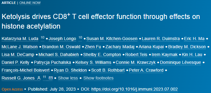 Katarzyna M. Luda et al. Ketolysis drives CD8+ T cell effector function through effects on histone acetylation. Immunity, 2023, doi:10.1016/j.immuni.2023.07.002.