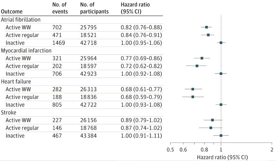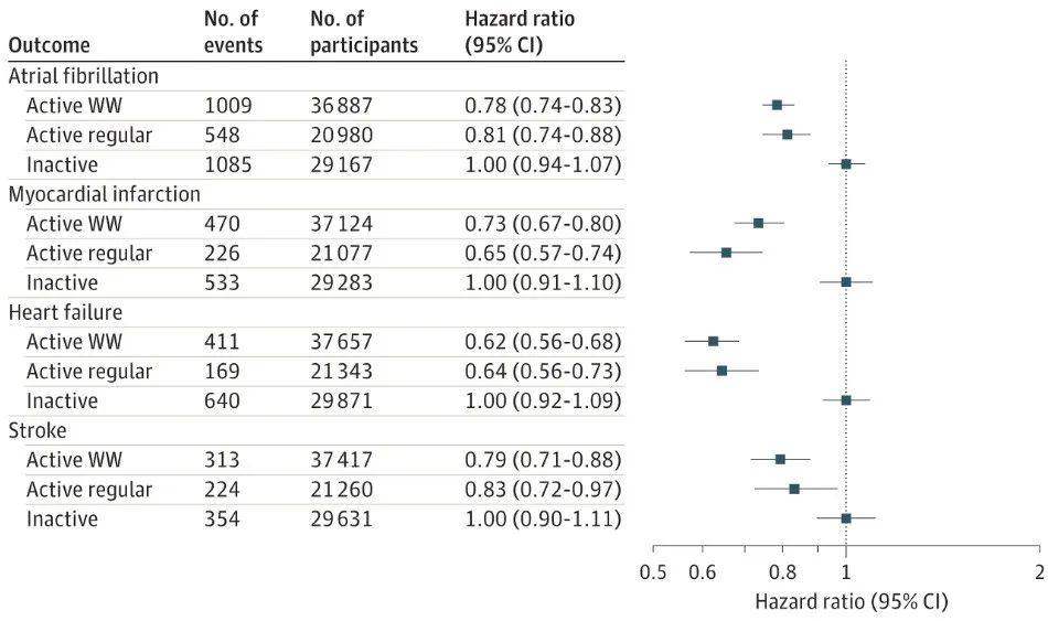 在校正了年龄、性别、种族/民族、抽烟习惯、汤森剥夺指数(人群社会经济环境)、酒精摄入量、受教育程度、就业情况、自报告健康状况和饮食质量这些因素后,与不达标组相比,WW组和均匀组分别与房颤风险下降22%和19%、心肌梗塞风险下降27%和35%、心力衰竭风险下降38%和36%,以及卒中风险下降21%和17%有关,下降幅度相似。