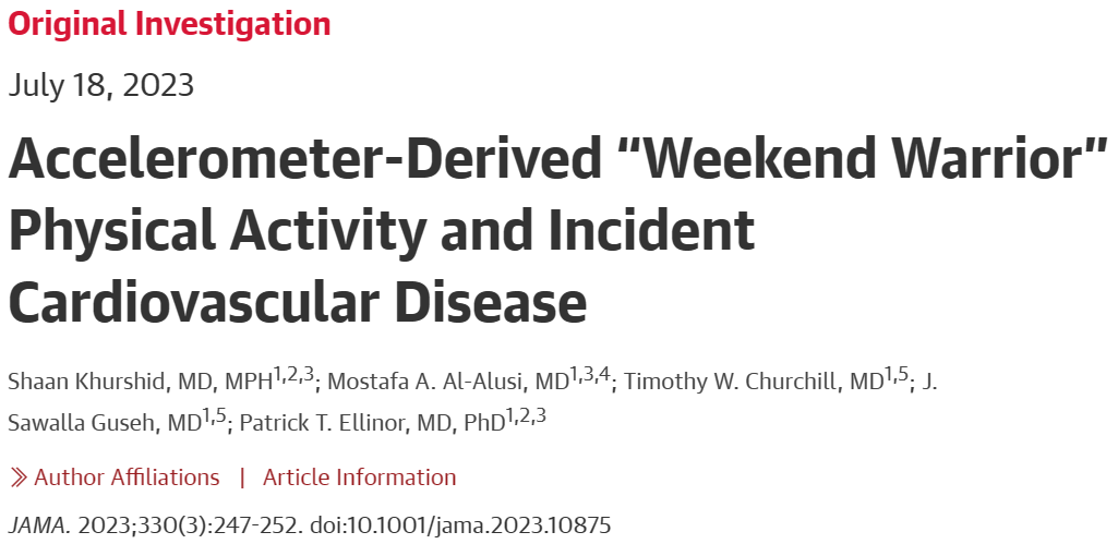 [1] Khurshid S, Al-Alusi M A, Churchill T W, et al. Accelerometer-Derived “Weekend Warrior” Physical Activity and Incident Cardiovascular Disease[J]. JAMA, 2023, 330(3): 247-252.
