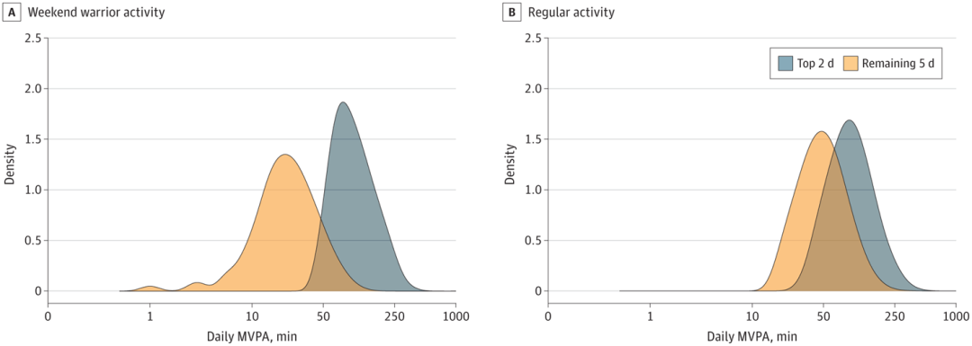 最终的分析纳入了89573例参与者,中位随访时间为6.3年。按照指南推荐的≥150分钟/周为标准,37872例参与者(42.2%)被分类为周末战士(WW)组,21473例(24.0%)为均匀组,30228例(33.7%)为不达标组。WW组在最活跃的2天里的MVPA比其余5天多得多,而均匀组的则比较一致。