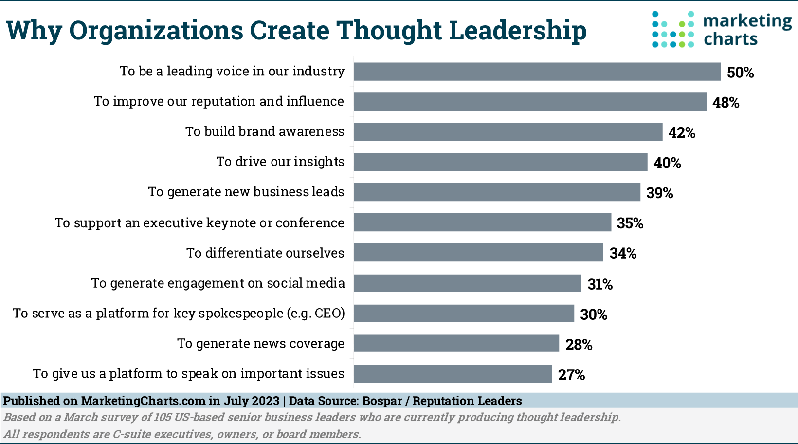 组织领导者创造思想领导力来引导行业对话,建立自己的声誉,与行业专家建立联系,并获得诸如提高声望和影响力,建立品牌知名度,推动洞察力和产生新的业务线索等利益。调查显示,决策者渴望高质量的内容。