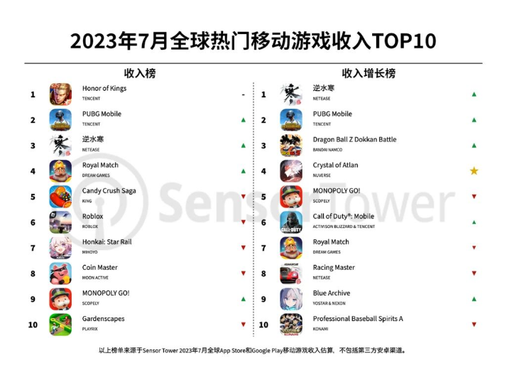 网易《逆水寒》手游以1.13亿美元收入位列榜单第3,不仅在7月稳居中国iPhone手游畅销榜前3,同时还登上了7月全球手游收入增长榜榜首。