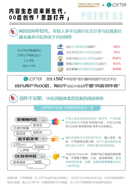 在互联网浪潮下成长的Z世代,面对自我的发展有一套独特的时代看法,同时也更倾向于自己参与创作。根据报告指出:截至今年6月,25岁以下网民占比达23.4%,各大内容平台创作者群体均呈现出年轻化趋势。网易LOFTER作为目前深受Z世代欢迎的内容创作和社交平台,拥有超过1300万创作者,其中九成都是00后,每10个00后就有1个是创作者。而这些新生代的内容创作者不被传统的创作形式所束缚,他们用自己的创意和脑洞语言营造全新的阅读体验。