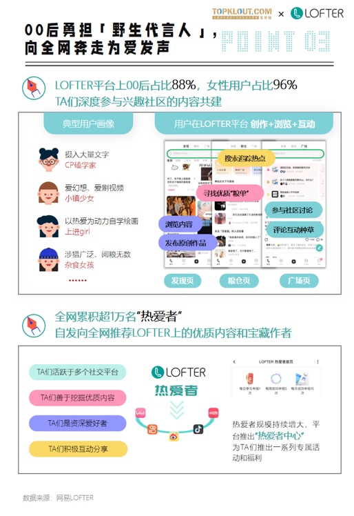 此外,这群00后除了创作内容,消费内容之外,还比任何一代更热衷于分享,乐于深度参与社区内容共建,自发为爱发声。据报告显示,目前在全网有累积超过1万名的“热爱者”, 她们是各领域内的资深爱好者,平日阅文无数,善于挖掘寻找优质内容,也乐于分享,积极在多个平台自发推荐在LOFTER发现的优质内容和宝藏创作者。