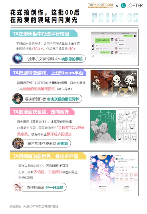 以LOFTER上的《张勇的手机》为例,以捡手机和桌面视频短剧相结合的形式。不断输出创意搞笑的校园剧情,收获了大量的粉丝,目前在多个平台累计粉丝量220万,播放量破3亿。视频创作者@山灰猫的栖云异梦,基于自己与室友的日常互动创作了一系列剧情视频,大受欢迎,然后把这个剧情自制做成了游戏创作涉及短视频、漫画、游戏多领域,开发国风解密游戏《栖云异梦》 上线Steam平台。漫画家@优癖 绘制的漫画《草原志怪:遗弃谷篇》获得2023年金猴奖漫画奖金奖;站内画手 @一只鸟鸟,与LOFTER平台合作推出首款创作者联名主题虚拟皮肤,深受用户欢迎,并因此获得了超过11万元的收入