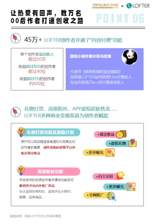 作为以00后为主力用户群的内容创作社区,LOFTER一直积极鼓励用户进行想象与创作、倡导友好的分享与交流,在提供一个多元开放包容的创作平台的同时,还一直尝试着通过多种扶持成长体系和激励计划,为年轻的同人创作者带来收益和应有的成就。先后推出礼物打赏、高级粉丝、APP虚拟皮肤售卖等产品功能和多种商业变现渠道为创作者赋能。
