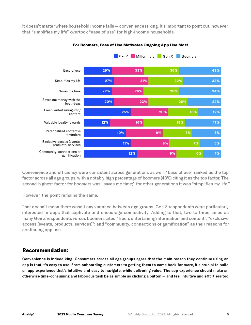 消费者下载的应用程序比以往任何时候都多,但考虑到当前的全球经济形势,人们持续使用应用的主要原因可能会让品牌感到惊讶。虽然品牌可能认为消费者最有可能转向应用程序以获得优惠或忠诚奖励,但更高层次的好处才是让消费者反复购买的原因。这些好处是什么?轻松方便。消费者使用应用程序的主要原因是“易用性”(35%)和“简化生活”(31%)。这种对便利性和效率的偏好远远超过了持续使用应用程序的其他原因。不出所料,在全球1.1万名受访者中,“节省时间”(27%)排在前三名。