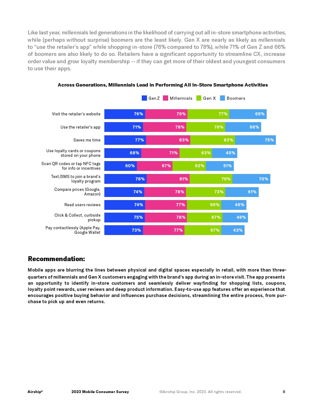 应用程序跨越数字到物理体验。零售业通常是“实体”体验的典范,但调查发现,每个行业都有潜力将数字和实体体验融合在一起,并因此获得回报。大部分受访者(74%)表示,他们在实体店购物时可能会“使用零售商的应用程序”。千禧一代最有可能在店内使用智能手机进行所有活动,而婴儿潮一代的可能性最小。X世代和千禧一代在店内购物时“使用零售商的应用程序”的比例几乎一样(分别为76%和78%);71%的Z世代和66%的婴儿潮一代也有可能这么做。