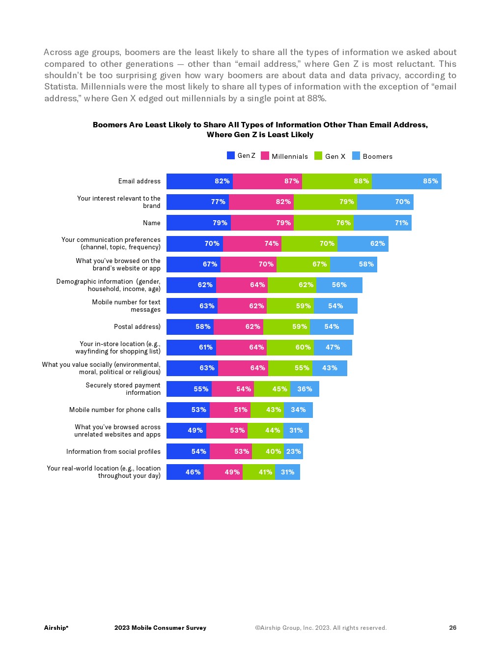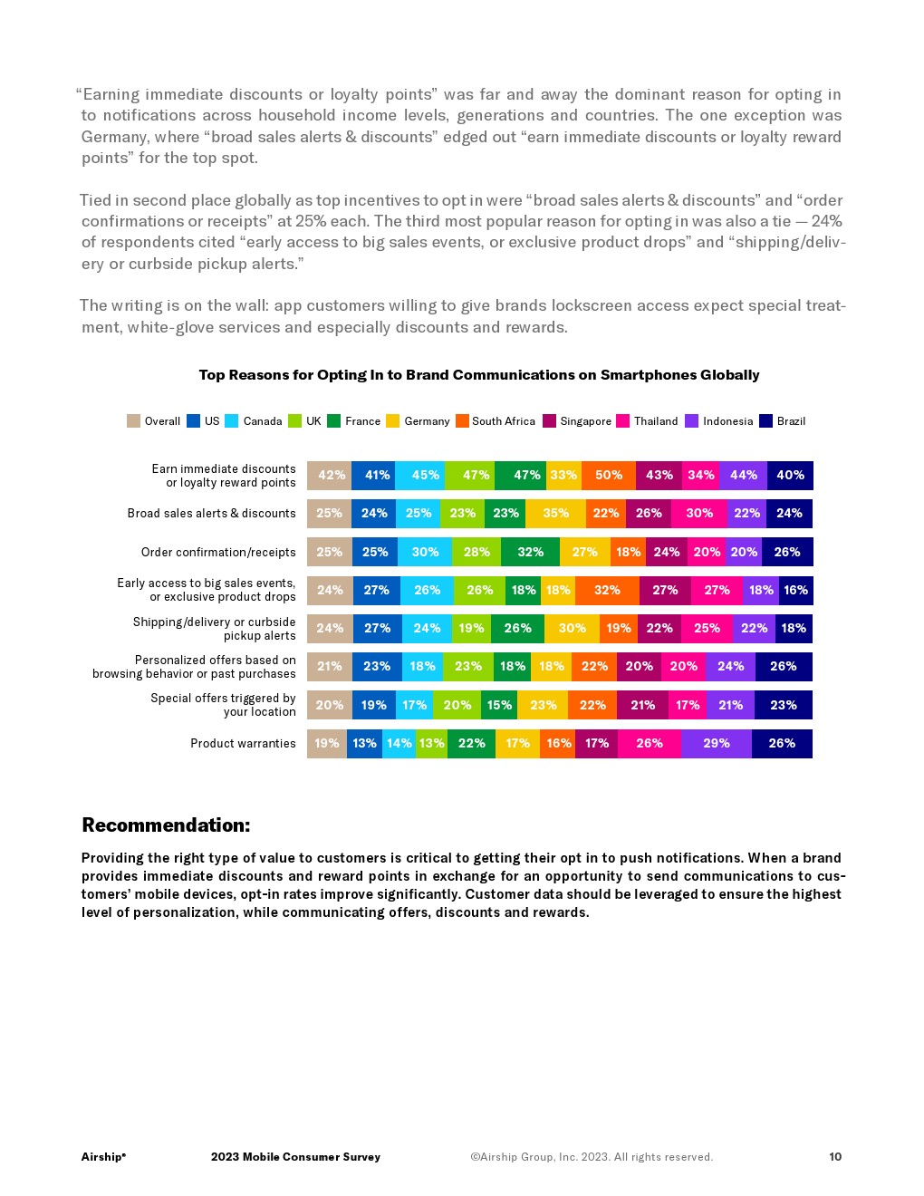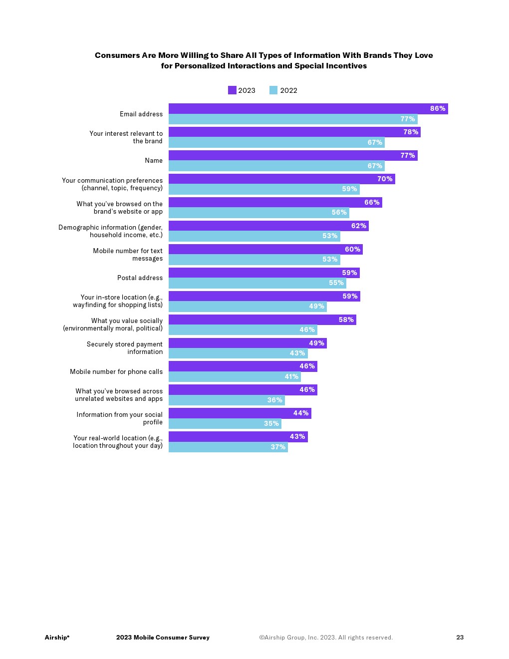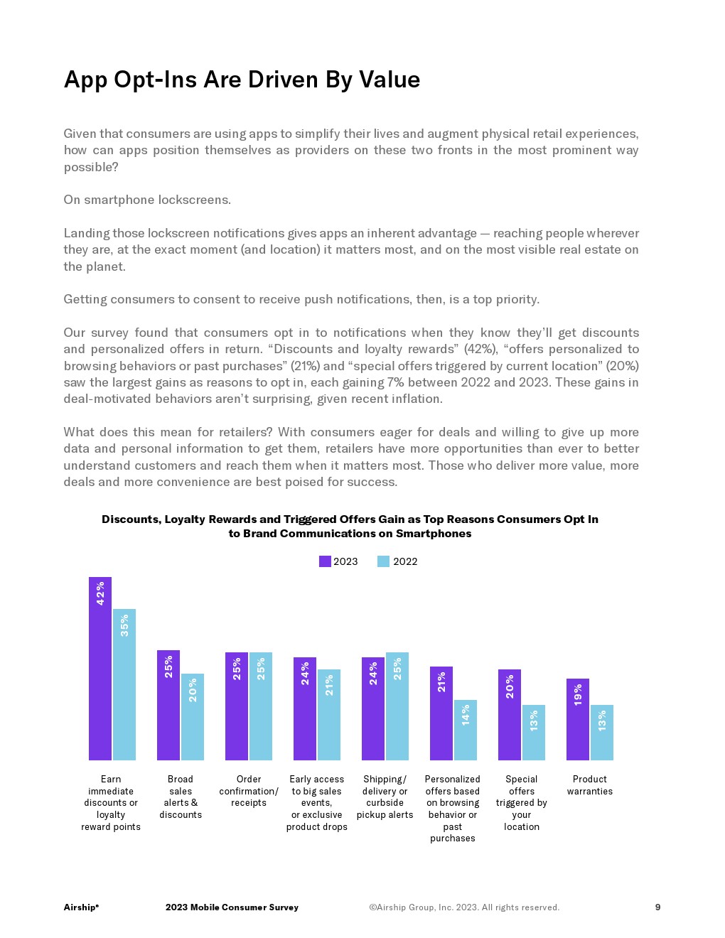 调查发现,当消费者知道自己将获得折扣和个性化优惠作为回报时,他们会选择接收通知。“折扣和忠诚奖励”(42%)、“根据浏览行为或过去的购买提供个性化服务”(21%)和“由当前位置触发的特别优惠”(20%)被认为是选择加入的最大原因,在2022年至2023年期间分别增长了7%。考虑到最近的通货膨胀,交易动机行为的增加并不令人意外。