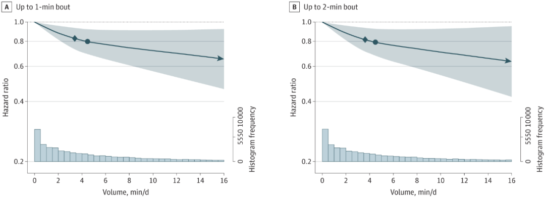 事实上,仅有6.2%的参与者未被收集到VILPA运动数据,且绝大多数的VILPA运动都在1/2分钟以内,说明大多数人还是能跨过门槛的;参与者的VILPA中位每日总时长为4.5分钟、最高总时长则为16分钟。