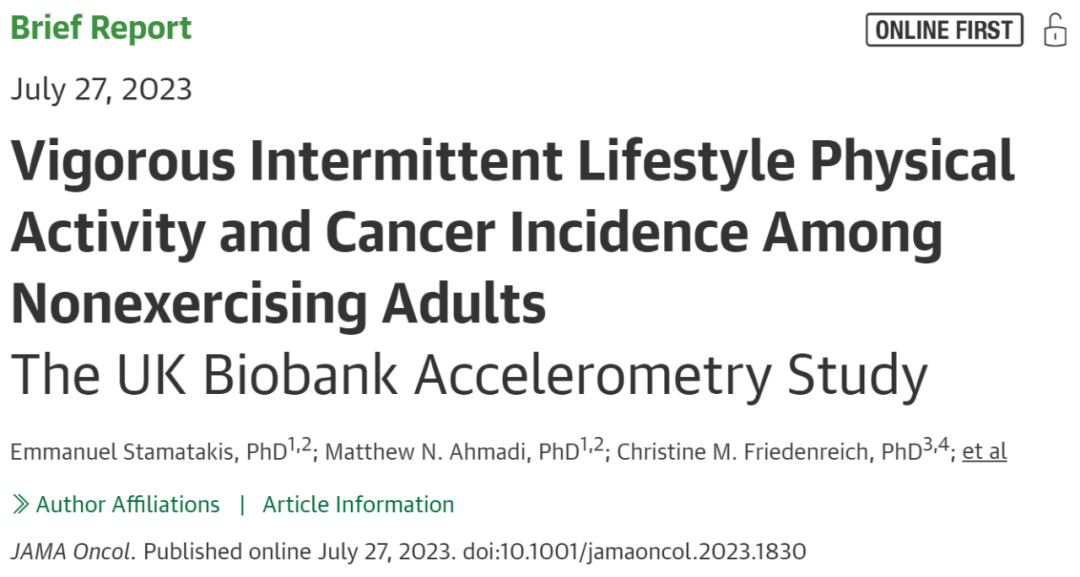 [1]Stamatakis E, Ahmadi M N, Friedenreich C M, et al. Vigorous Intermittent Lifestyle Physical Activity and Cancer Incidence Among Nonexercising Adults: The UK Biobank Accelerometry Study[J]. JAMA Oncology, 2023.
